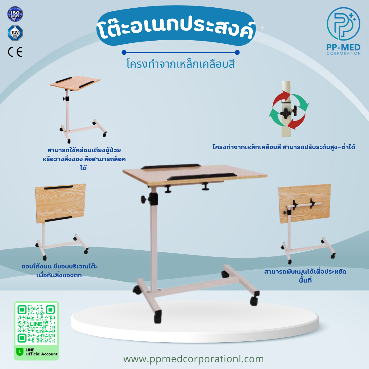 • เป็นโต๊ะขาเดียว สามารถใช้คร่อมเตียงผู้ป่วย หรือวางสิ่งของ